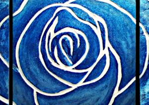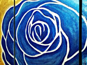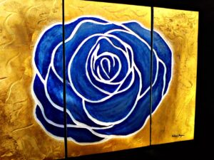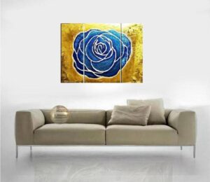 Rosa blu trittico pannello in legno marino foglia oro e acrilico 150×80 cm
